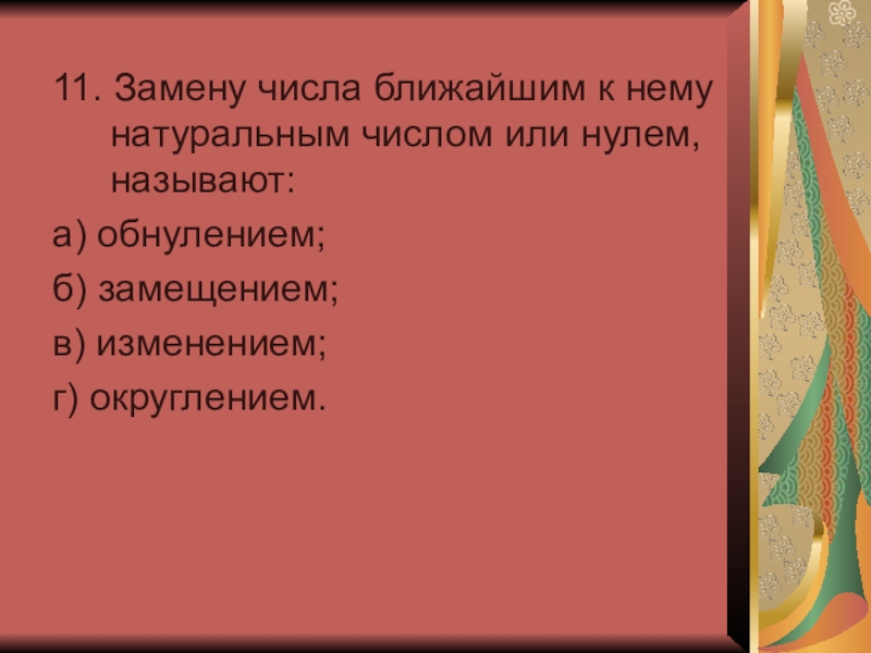 11. Замену числа ближайшим к нему натуральным числом или нулем, называют:а) обнулением;		б) замещением;	в) изменением;	г) округлением.