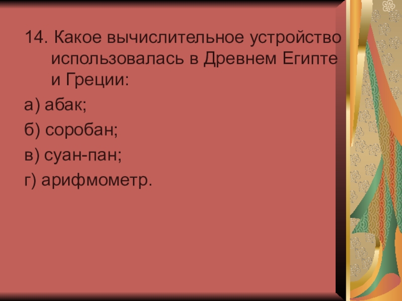 Слайд 1514. Какое вычислительное устройство использовалась в Древнем Египте и Греции: