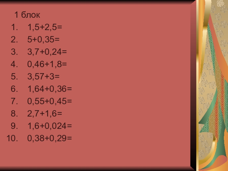 1 блок1,5+2,5=5+0,35=3,7+0,24=0,46+1,8=3,57+3=1,64+0,36=0,55+0,45=2,7+1,6=1,6+0,024=0,38+0,29=