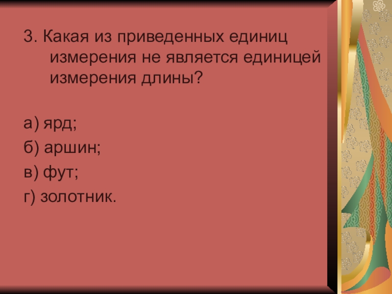 3. Какая из приведенных единиц измерения не является единицей измерения длины? а) ярд;		б) аршин;		в) фут;		г) золотник.