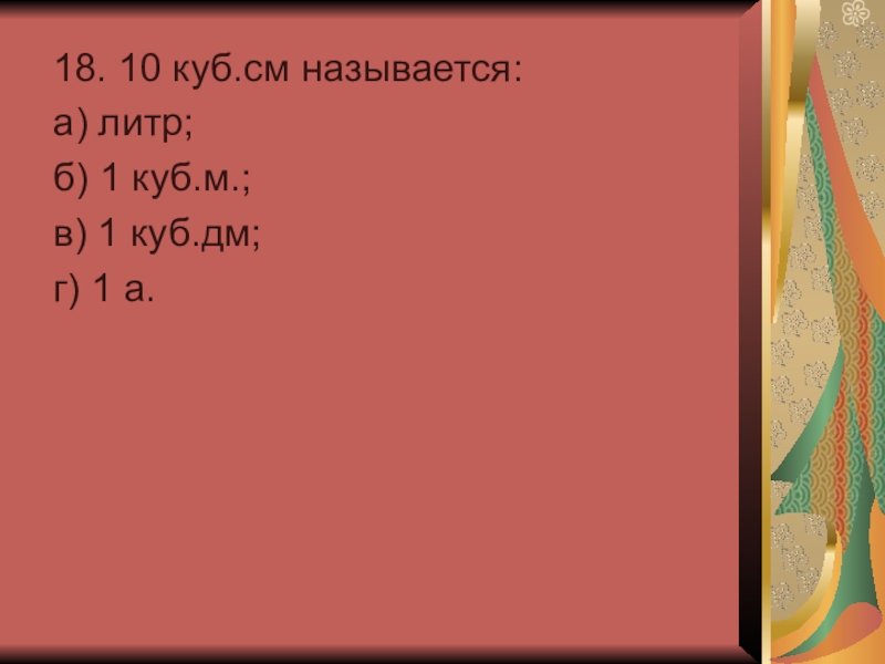 18. 10 куб.см называется:а) литр;		б) 1 куб.м.;		в) 1 куб.дм;		г) 1 а.