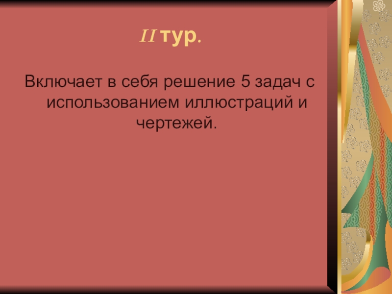 II тур.Включает в себя решение 5 задач с использованием иллюстраций и чертежей.