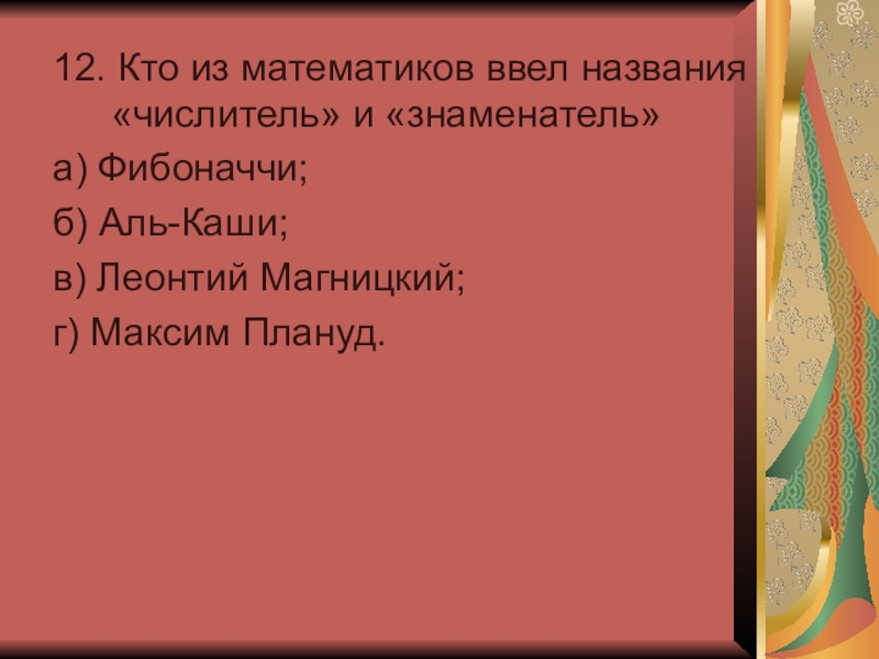 12. Кто из математиков ввел названия «числитель» и «знаменатель»а) Фибоначчи; 	б) Аль-Каши;	в) Леонтий Магницкий; г) Максим Плануд.