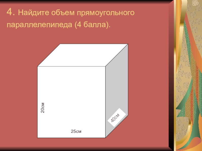 4. Найдите объем прямоугольного параллелепипеда (4 балла). 20см40см25см