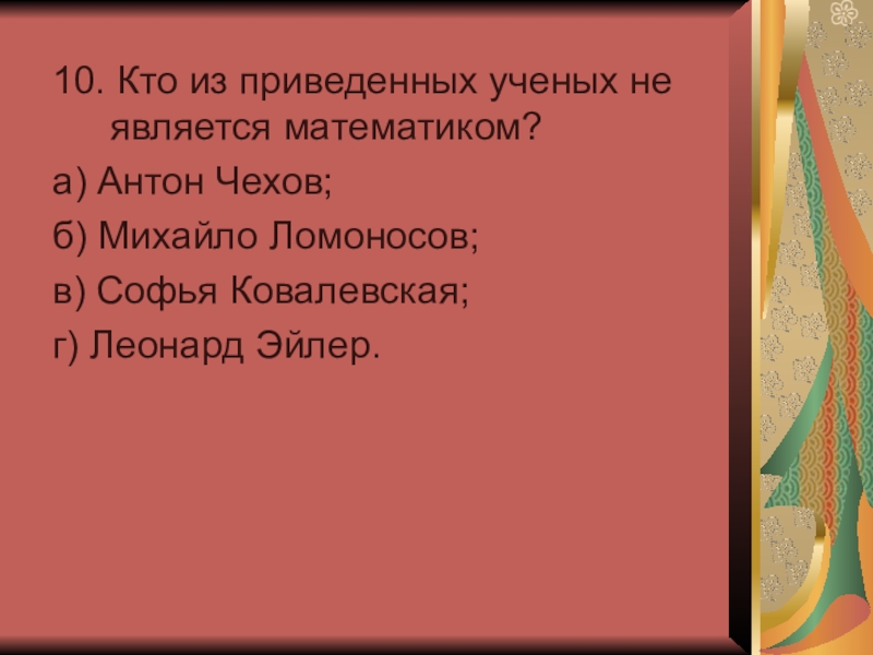 10. Кто из приведенных ученых не является математиком?а) Антон Чехов;	б) Михайло Ломоносов; 	в) Софья Ковалевская;		г) Леонард Эйлер.