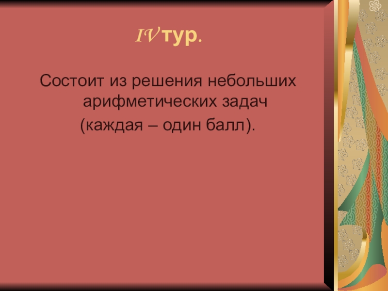 IV тур.Состоит из решения небольших арифметических задач (каждая – один балл).