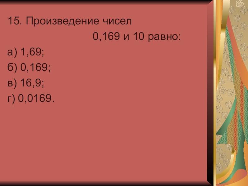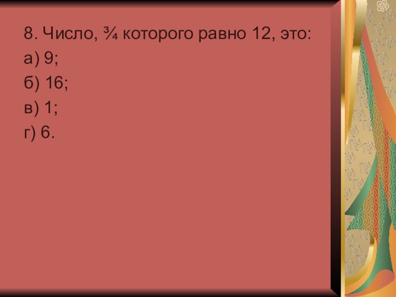 8. Число, ¾ которого равно 12, это:а) 9;		б) 16;	в) 1;		г) 6.