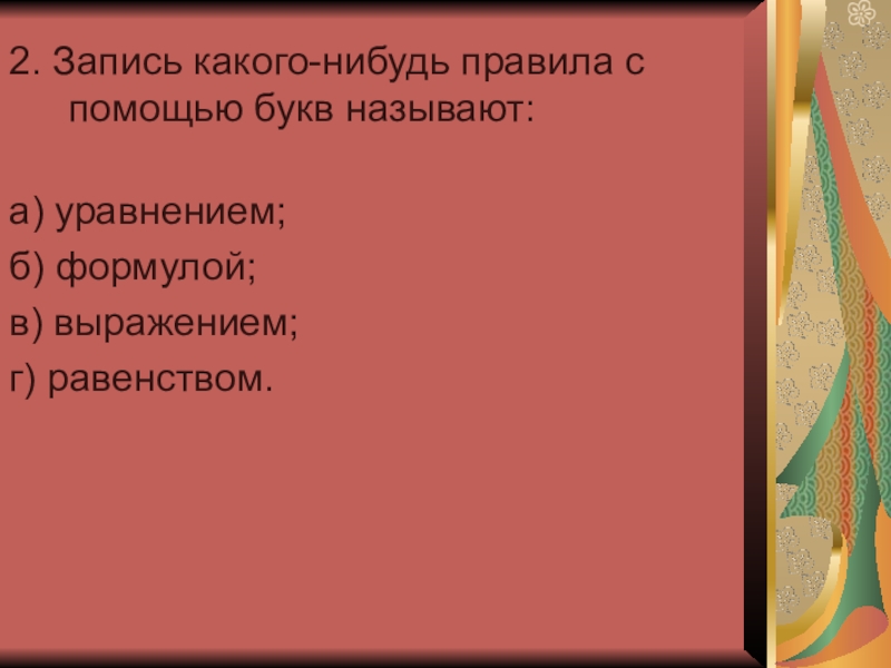 2. Запись какого-нибудь правила с помощью букв называют: а) уравнением;	б) формулой;		в) выражением;	г) равенством.