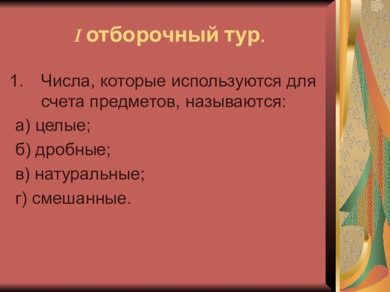 I отборочный тур.Числа, которые используются для счета предметов, называются:а) целые;	б) дробные; 	в) натуральные;	г) смешанные.