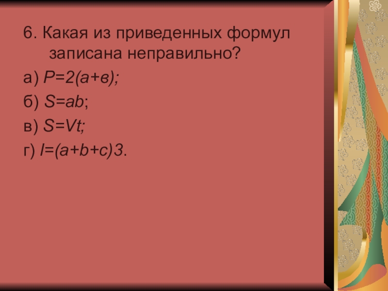 6. Какая из приведенных формул записана неправильно?а) Р=2(а+в);		б) S=ab;		в) S=Vt;		г) l=(a+b+c)3.