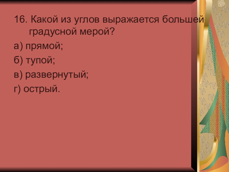 16. Какой из углов выражается большей градусной мерой?а) прямой;	б) тупой;	в) развернутый;	г) острый.