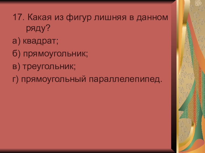 17. Какая из фигур лишняя в данном ряду?а) квадрат;		б) прямоугольник;		в) треугольник;	г) прямоугольный параллелепипед.
