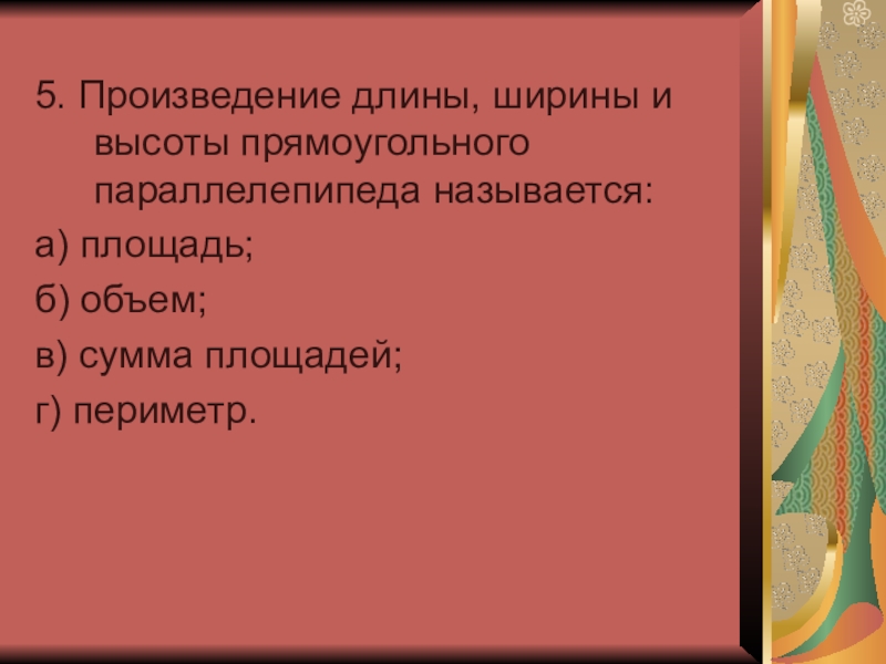 5. Произведение длины, ширины и высоты прямоугольного параллелепипеда называется:а) площадь;		б) объем;		в) сумма площадей;		г) периметр.