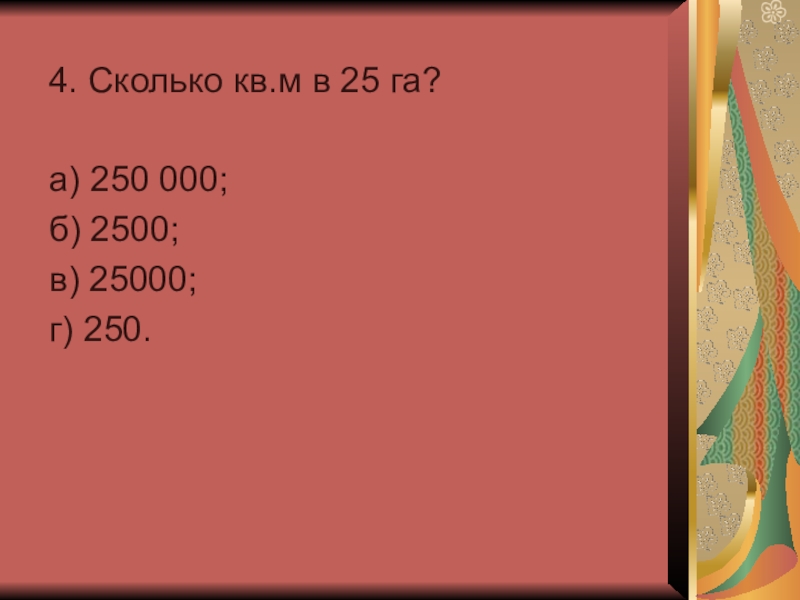 4. Сколько кв.м в 25 га?а) 250 000;		б) 2500;		в) 25000;		г) 250.