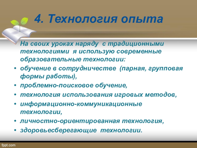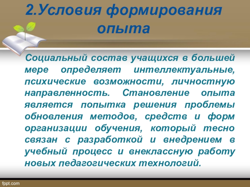 интеллектуальные, психические возможности, личностную направленность. Становление опыта является попытка решения проблемы обновления методов, средств и форм организации обучения, который тесно связан с разработкой и внедрением в учебный процесс и внеклассную работу новых педагогических технологий.
