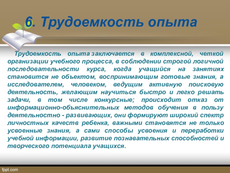 Трудоемкость опыта заключается в комплексной, четкой организации учебного