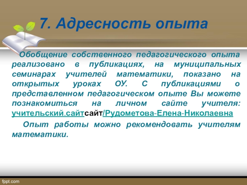 на муниципальных семинарах учителей математики, показано на открытых уроках ОУ. С публикациями о представленном педагогическом опыте Вы можете познакомиться на личном сайте учителя: учительский.сайтсайт/Рудометова-Елена-Николаевна