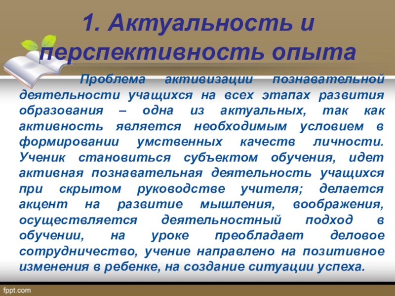 на всех этапах развития образования – одна из актуальных, так как активность является необходимым условием в формировании умственных качеств личности. Ученик становиться субъектом обучения, идет активная познавательная деятельность учащихся при скрытом руководстве учителя; делается акцент на развитие мышления, воображения, осуществляется деятельностный подход в обучении, на уроке преобладает деловое сотрудничество, учение направлено на позитивное изменения в ребенке, на создание ситуации успеха.