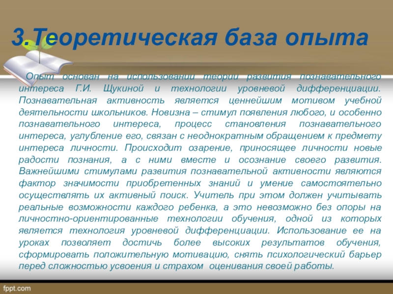 познавательного интереса Г.И. Щукиной и технологии уровневой дифференциации. Познавательная активность является ценнейшим мотивом учебной деятельности школьников. Новизна – стимул появления любого, и особенно познавательного интереса, процесс становления познавательного интереса, углубление его, связан с неоднократным обращением к предмету интереса личности. Происходит озарение, приносящее личности новые радости познания, а с ними вместе и осознание своего развития. Важнейшими стимулами развития познавательной активности являются фактор значимости приобретенных знаний и умение самостоятельно осуществлять их активный поиск. Учитель при этом должен учитывать реальные возможности каждого ребенка, а это невозможно без опоры на личностно-ориентированные технологии обучения, одной из которых является технология уровневой дифференциации. Использование ее на уроках позволяет достичь более высоких результатов обучения, сформировать положительную мотивацию, снять психологический барьер перед сложностью усвоения и страхом оценивания своей работы.