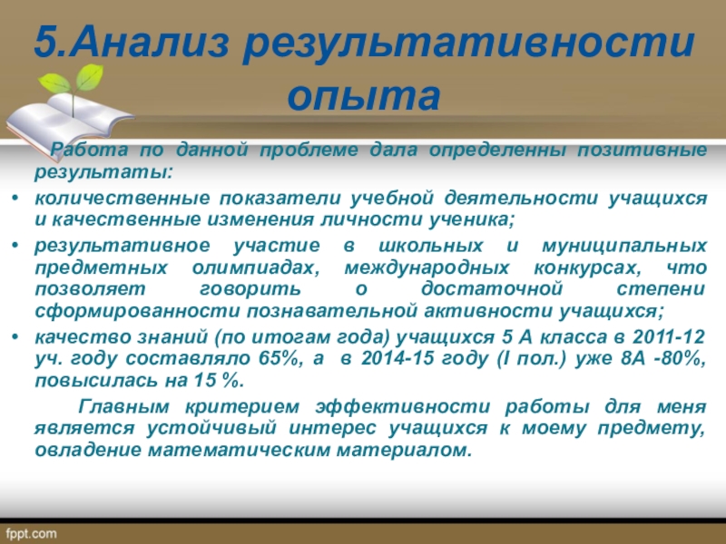 Главным критерием эффективности работы для меня является устойчивый интерес учащихся к моему предмету, овладение математическим материалом.