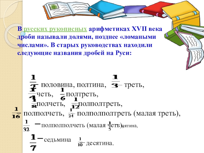 Слайд 19В русских рукописных арифметиках XVII века дроби называли долями, позднее «ломаными числами». В