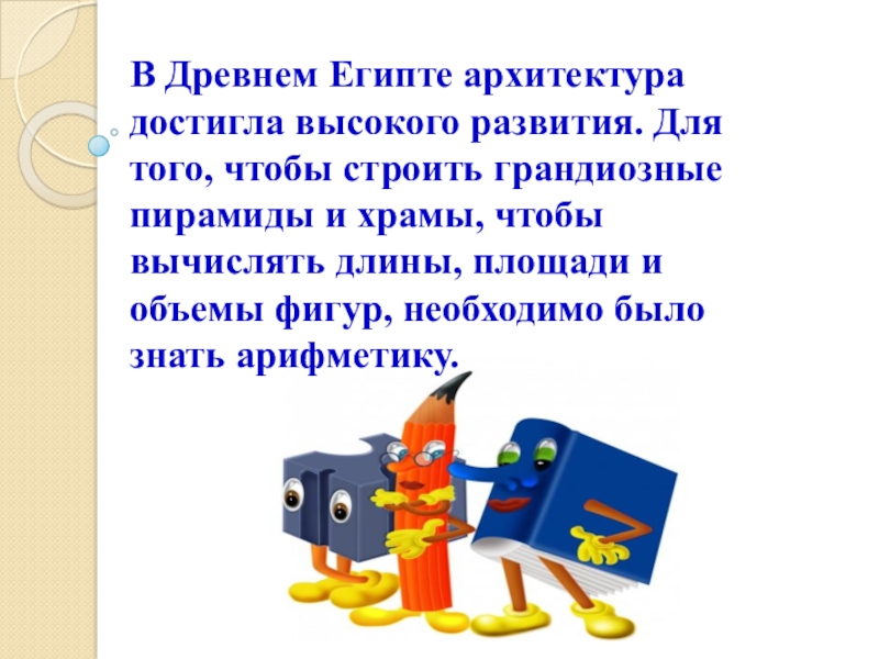 грандиозные пирамиды и храмы, чтобы вычислять длины, площади и объемы фигур, необходимо было знать арифметику.