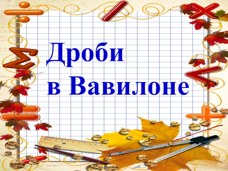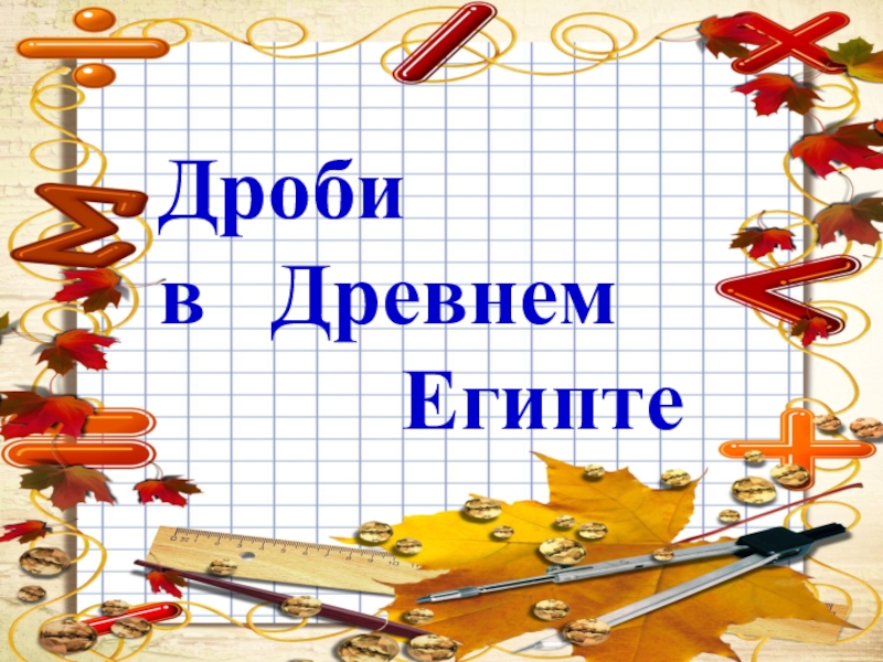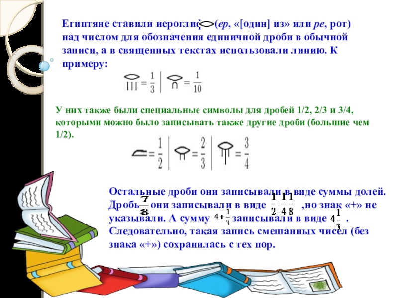 Остальные дроби они записывали в виде суммы долей. Дробь они записывали в виде ,но знак «+» не указывали. А сумму записывали в виде . Следовательно, такая запись смешанных чисел (без знака «+») сохранилась с тех пор.