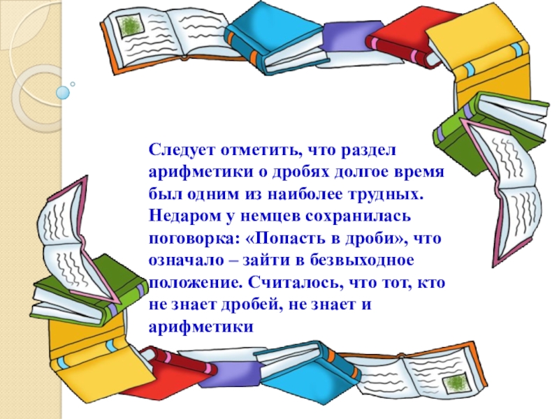 Слайд 21Следует отметить, что раздел арифметики о дробях долгое время был одним