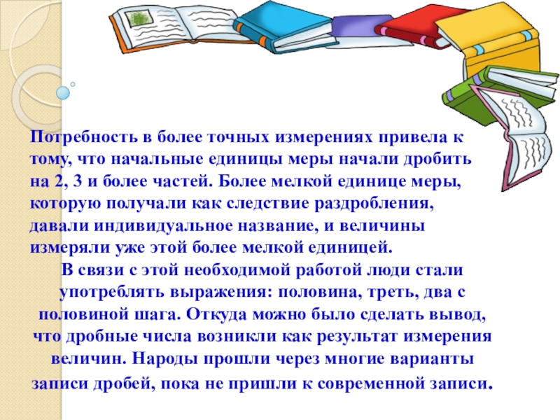В связи с этой необходимой работой люди стали употреблять выражения: половина, треть, два с половиной шага. Откуда можно было сделать вывод, что дробные числа возникли как результат измерения величин. Народы прошли через многие варианты записи дробей, пока не пришли к современной записи.