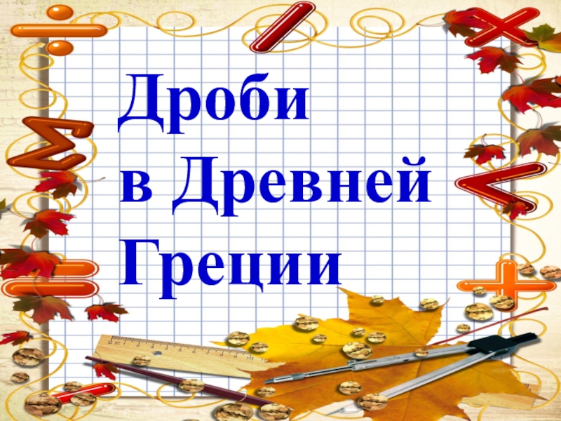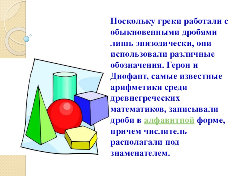 Слайд 10Поскольку греки работали с обыкновенными дробями лишь эпизодически, они использовали различные