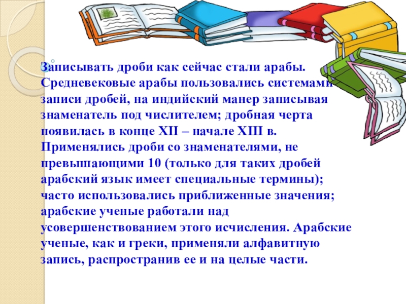 дробей, на индийский манер записывая знаменатель под числителем; дробная черта появилась в конце XII – начале XIII в. Применялись дроби со знаменателями, не превышающими 10 (только для таких дробей арабский язык имеет специальные термины); часто использовались приближенные значения; арабские ученые работали над усовершенствованием этого исчисления. Арабские ученые, как и греки, применяли алфавитную запись, распространив ее и на целые части.