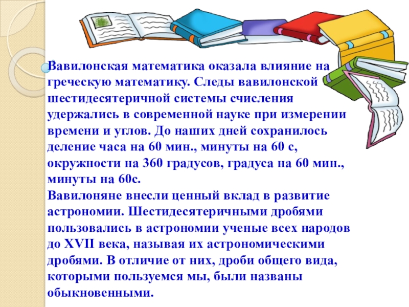 Вавилоняне внесли ценный вклад в развитие астрономии. Шестидесятеричными дробями пользовались в астрономии ученые всех народов до XVII века, называя их астрономическими дробями. В отличие от них, дроби общего вида, которыми пользуемся мы, были названы обыкновенными.