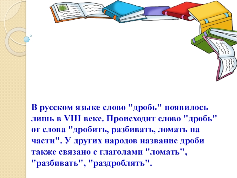 Слайд 18В русском языке слово "дробь" появилось лишь в VIII веке. Происходит