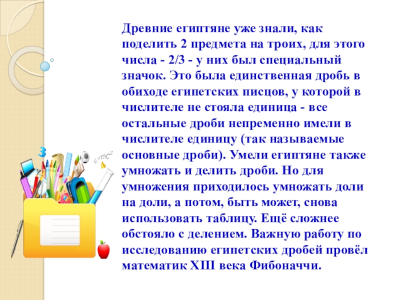 Слайд 8Древние египтяне уже знали, как поделить 2 предмета на троих, для