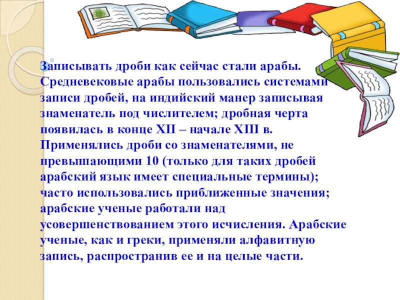 Слайд 12Записывать дроби как сейчас стали арабы. Средневековые арабы пользовались системами записи