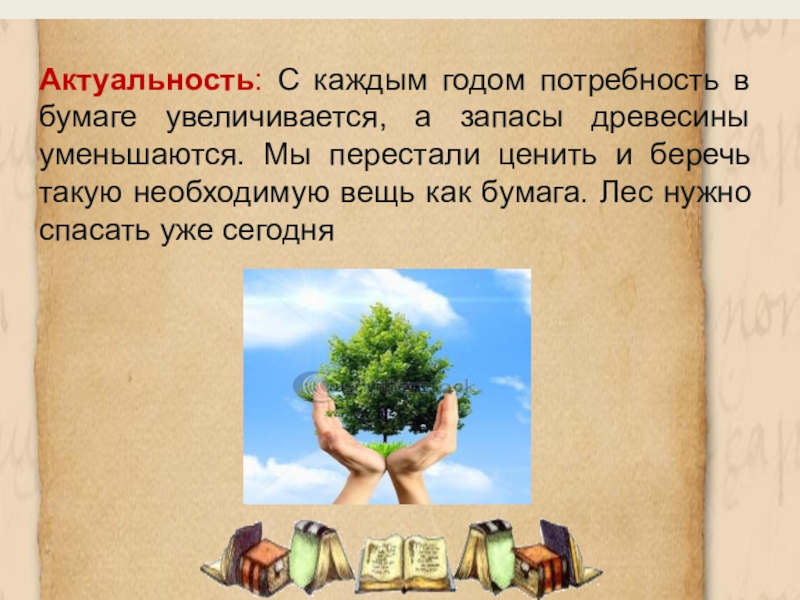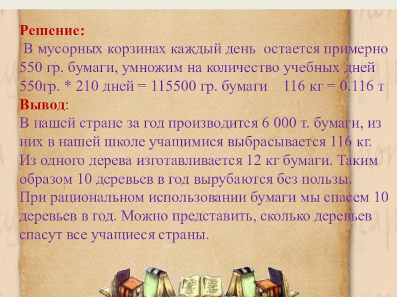 Если ученики и учителя будут рационально использовать бумагу в образовательном процессе, то можно сократить количество затрачиваемых ресурсов ((деревьев), энергоресурсов) для изготовления бумажных продуктов (учебники и тетради) и таким образом внести вклад в сохранение природной среды и улучшение экологической обстановки в нашей стране