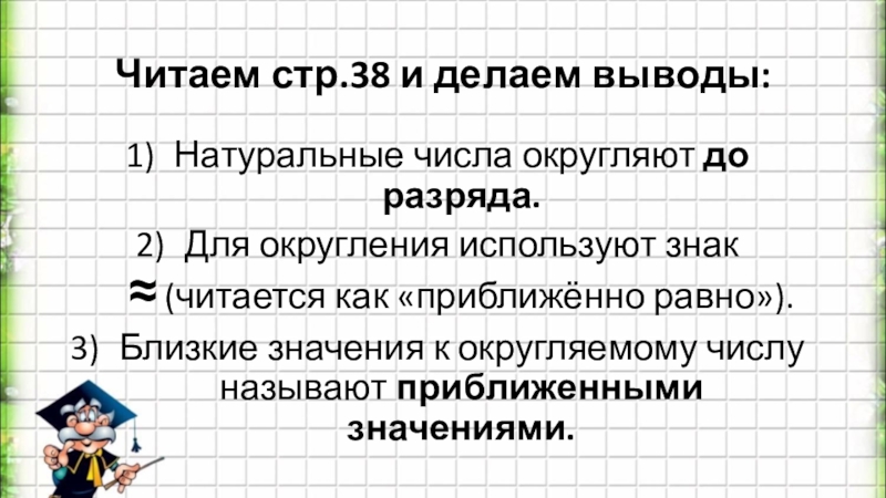 Читаем стр.38 и делаем выводы:Натуральные числа округляют до разряда.Для округления используют знак ≈ (читается как «приближённо равно»).Близкие значения
