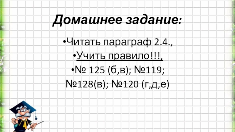 Домашнее задание:Читать параграф 2.4., Учить правило!!!, № 125 (б,в); №119;№128(в); №120 (г,д,е)