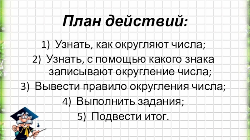 План действий:Узнать, как округляют числа;Узнать, с помощью какого знака записывают округление числа;Вывести правило округления числа;Выполнить задания;Подвести итог.