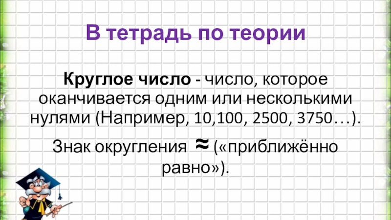 В тетрадь по теорииКруглое число - число, которое оканчивается одним или несколькими нулями (Например, 10,100, 2500, 3750…).Знак
