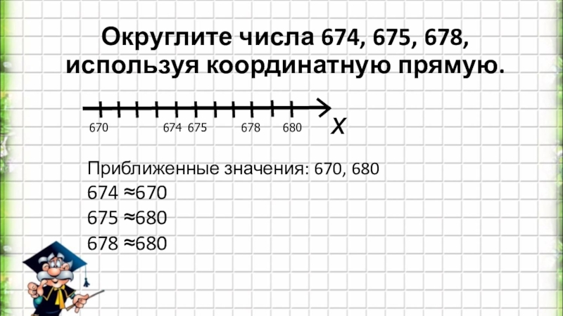 Слайд 7Округлите числа 674, 675, 678, используя координатную прямую.