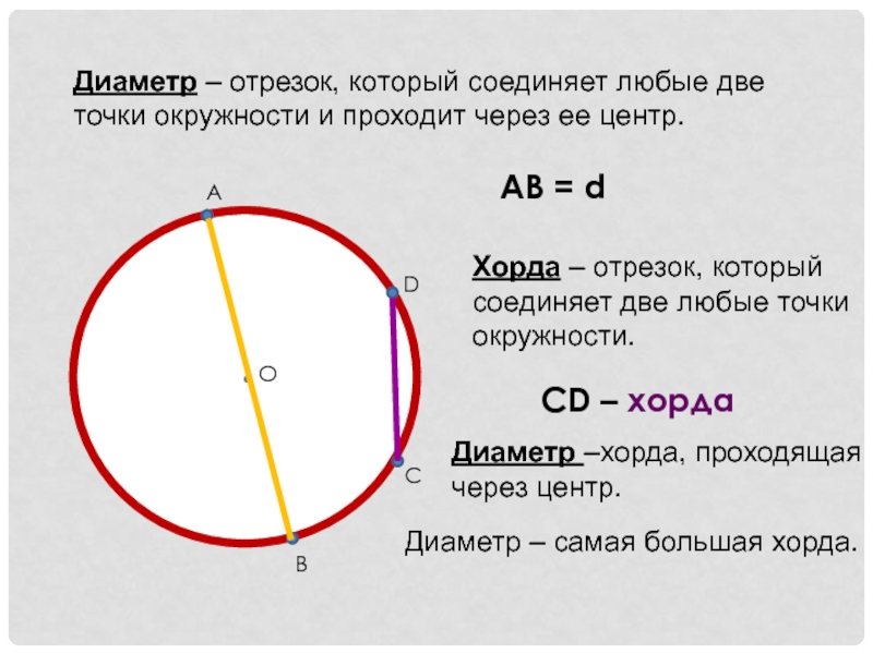 Хорда – отрезок, который соединяет две любые точки окружности.