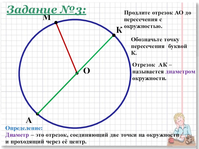 Диаметр – это отрезок, соединяющий две точки на окружности и проходящий через её центр.