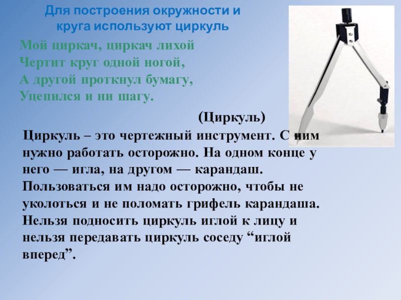 Циркуль – это чертежный инструмент. С ним нужно работать осторожно. На одном конце у него — игла, на другом — карандаш. Пользоваться им надо осторожно, чтобы не уколоться и не поломать грифель карандаша. Нельзя подносить циркуль иглой к лицу и нельзя передавать циркуль соседу “иглой вперед”.