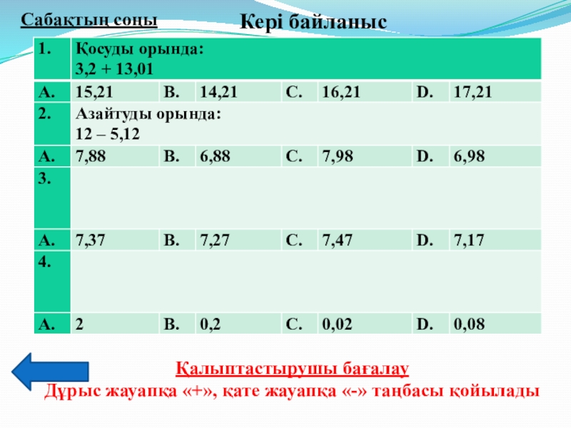 Дұрыс жауапқа «+», қате жауапқа «-» таңбасы қойылады