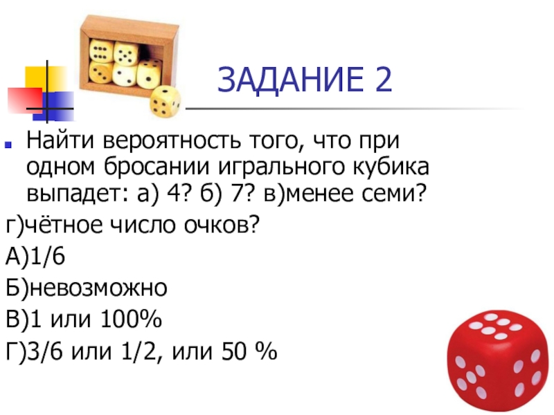 ЗАДАНИЕ 2Найти вероятность того, что при одном бросании игрального кубика выпадет: а) 4? б) 7? в)менее семи?г)чётное число очков?А)1/6Б)невозможноВ)1 или 100%Г)3/6 или 1/2, или 50 %