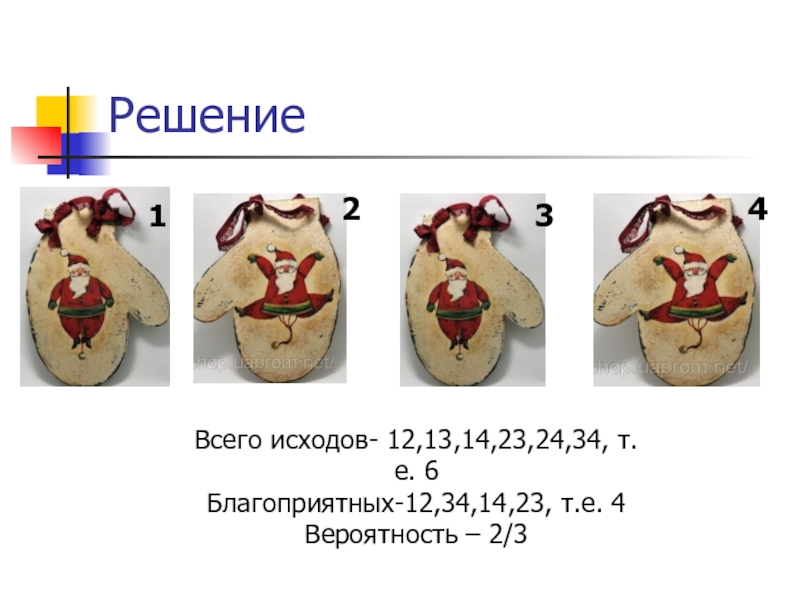 Решение 1234Всего исходов- 12,13,14,23,24,34, т.е. 6Благоприятных-12,34,14,23, т.е. 4Вероятность – 2/3