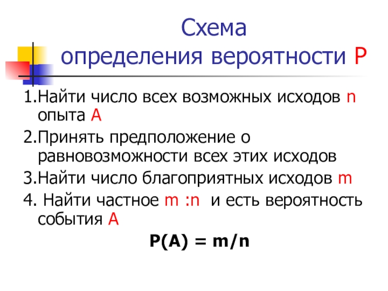 Схема  определения вероятности P1.Найти число всех возможных исходов n опыта A2.Принять предположение о равновозможности всех этих