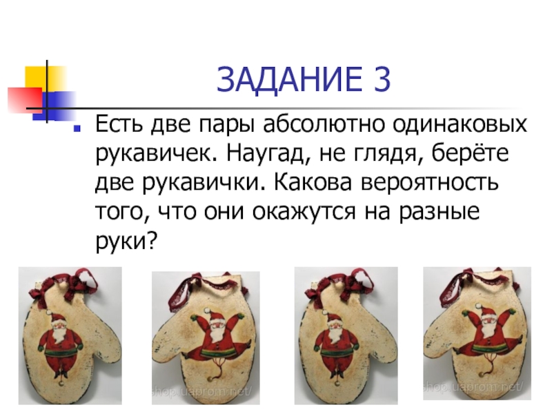 ЗАДАНИЕ 3Есть две пары абсолютно одинаковых рукавичек. Наугад, не глядя, берёте две рукавички. Какова вероятность того, что