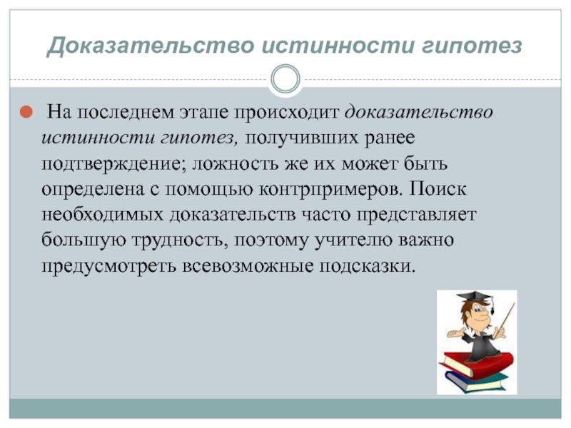 ранее подтверждение; ложность же их может быть определена с помощью контрпримеров. Поиск необходимых доказательств часто представляет большую трудность, поэтому учителю важно предусмотреть всевозможные подсказки.